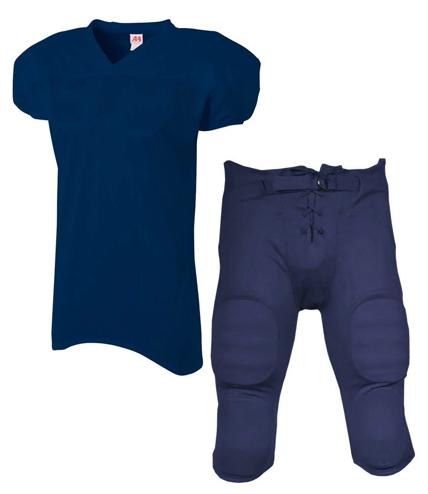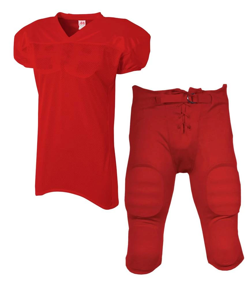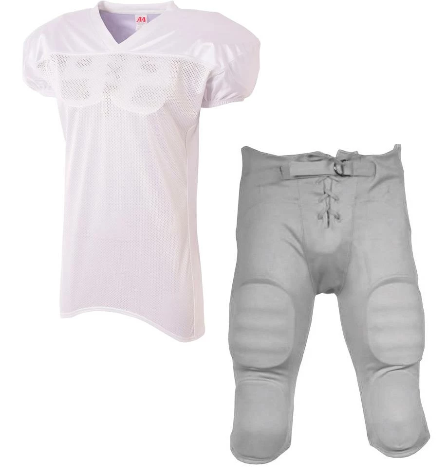Suit up this season in the A4 Nickelback Adult Football Uniform With Integrated Pants. An affordable package, this uniform includes the A4 Nickelback jersey and Sports Unlimited integrated football pants. The Nickelback jersey +features a polyester mesh body and nylon shoulders with moisture wicking and anti odor properties. The integrated football pants featuring padding in the highs, knees, hips and tailbone along with a lace-up fly and belt for comfort and fit. Screen print this uniform with your team name and numbers for a great on-field look!