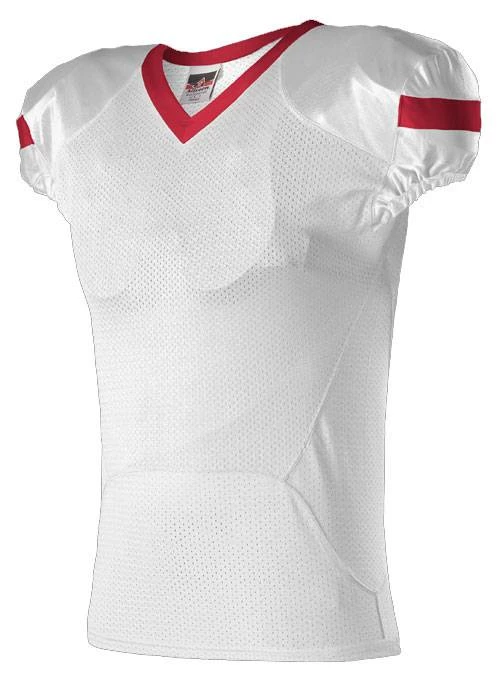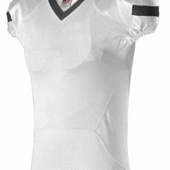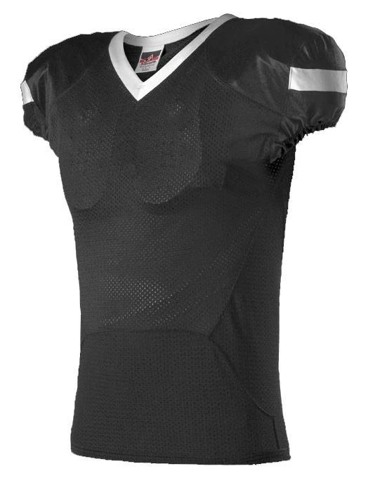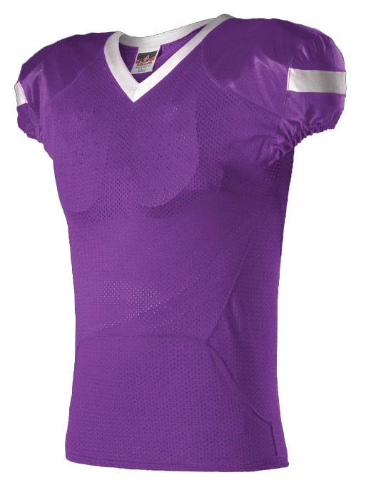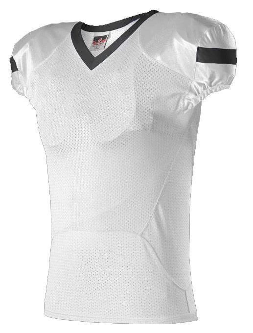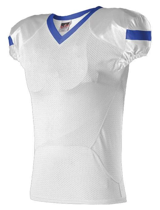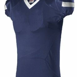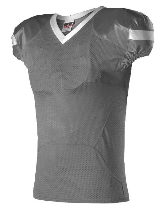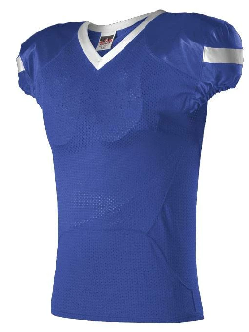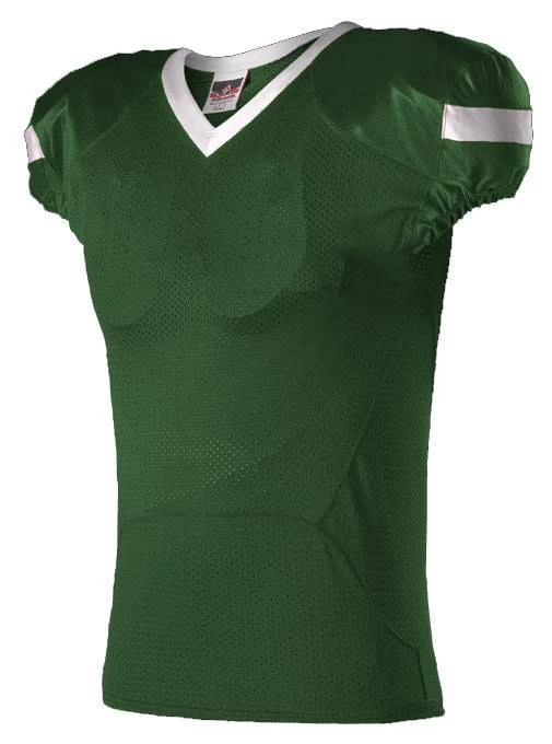 The Alleson Youth/Adult Pro Flex Cut Belt Length Custom Football Jersey is tailored to contour the shoulder and arms for improved range of motion and a no grab fit. Features include contrast color +elastane triple bar-tacked set-in mitered v-neck collar, belt length 3/4″ covered elastic hem. Cover seamed throughout for additional strength and appearance. Moisture management tricot mesh for breathability and additional comfort. Customize it for your team.