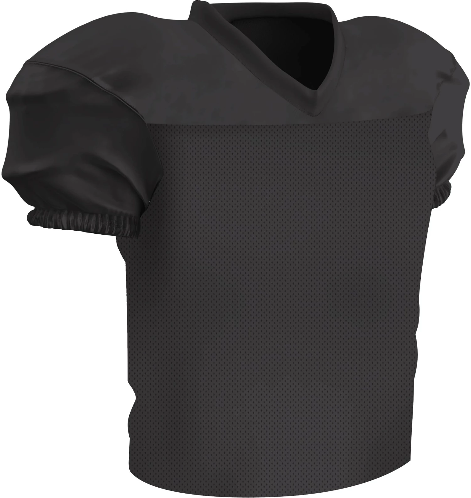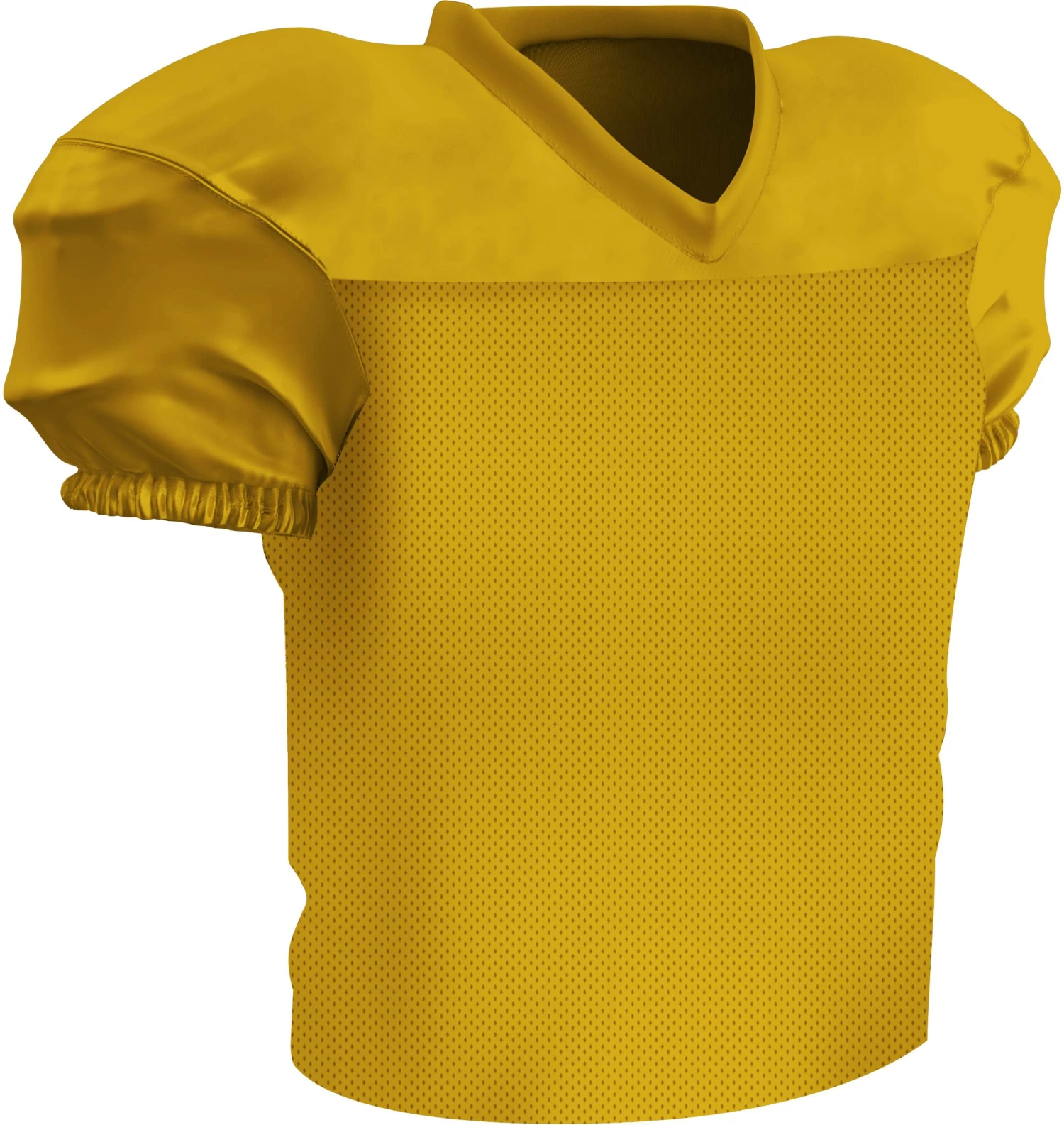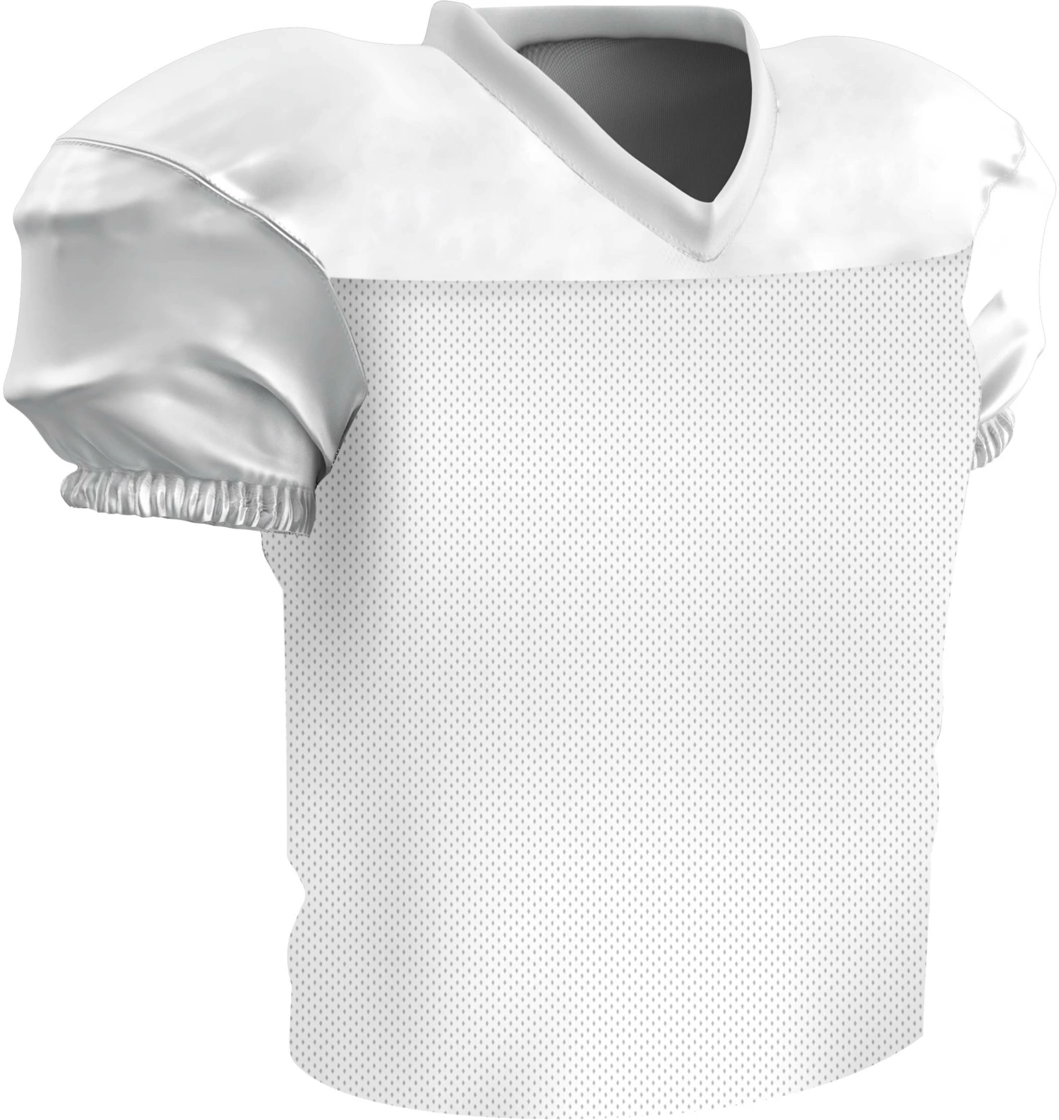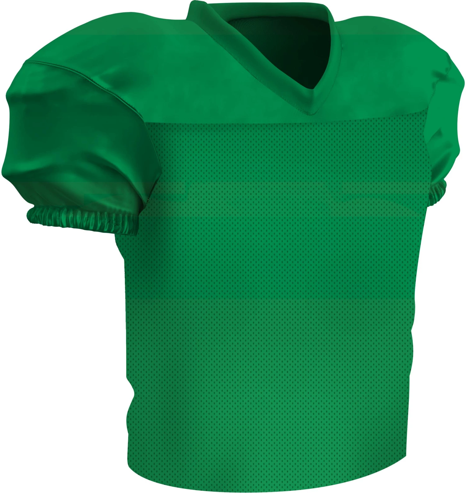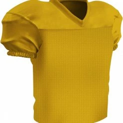 The Champro Preseason Youth Football Practice Jersey gives you all the features of the Time Out jersey with additional fabric that makes it waist length. It’s built for movement with a stretch poly +dazzle double-ply cowl, sleeves and v-neck to go along with a polyester stretch mesh body. The mitered V-neck leaves room for decoration and a finished elastic sleeve and double-needle hemmed bottom gives it a gameday look.