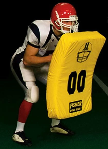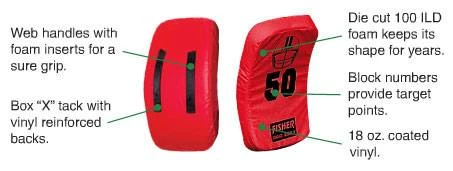 The Fisher 10003 36″ x 22″ x 5″ Jumbo Curved Football Shield features an extra large size to protect players while allowing for more intense contact during drills. Die cut 100 ILD foam +will keep its shape through years of blows and beatings. Sturdy web handles with foam inserts and box X tack for a sure grip. Coated with 18 oz. vinyl with block numbers and helmet printed on the front for target points. Excellent for training and building player confidence. This football shield is suitable for high school and college level practice.