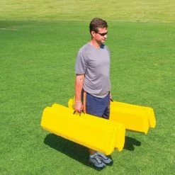 The Fisher 4 Man Brute Football Sled provides real life training for offensive linemen with flat leaf springs which deflect to absorb the shock and bounce back to provide the same effect as +player on player contact. Constructed of individual component stations which allow a 2 man sled to be upgraded to 3 or more men and a 5 man sled to be broken down to a 2 man and 3 man sled. Sled skids are formed, not cut and welded and feature a 30 degree angle for a smooth transition over grass or turf. Each high density, 100 lb impact resistant foam pad is triple stitched to withstand harsh weather and years of hard use. 5 different pad styles with 11 different vinyl cover colors available. 5 year manufacturer warranty and powder coated metal provides maximum weather resistance and confidence that this blocking sled will last through years of training. Recommended for high school ages and above.
