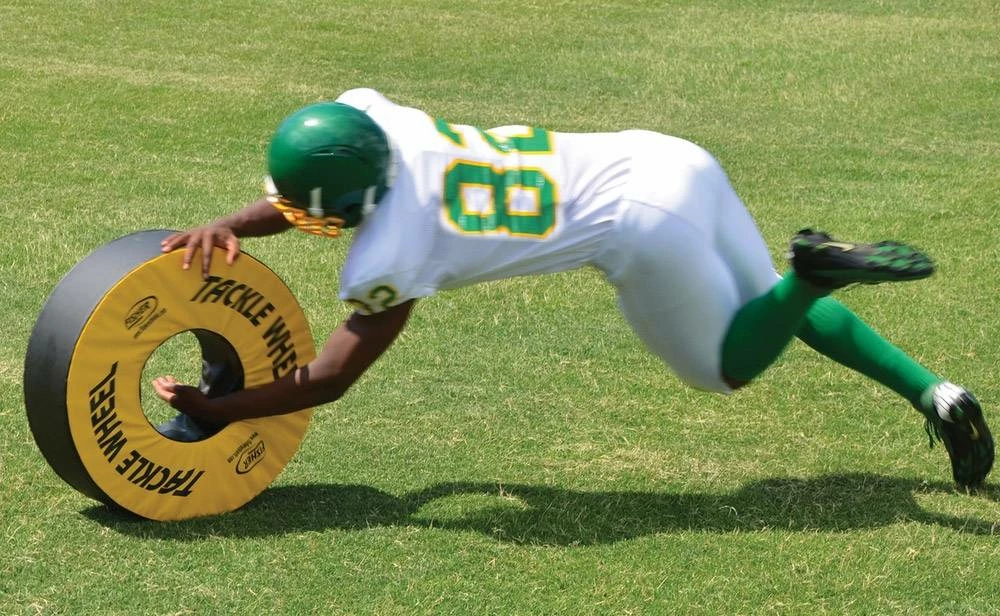 The Fisher Football 36″ Pursue and Tackle Wheel is a great training aid for tackle drills that reduces injuries to players. The tackle wheel is constructed of rebound foam with a durable coated +vinyl covering. Helps teach players to adjust their angle in pursuit and wrap up players in the open field.