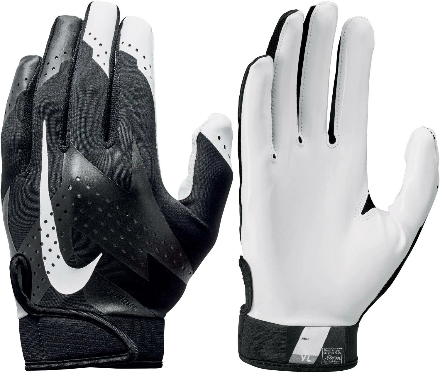 One of the best grips Nike has ever made makes the Nike Torque 2.0 Youth Football Receiver Gloves an great addition to your game day setup. Made with a Magnigrip palm, balls will +stick to this glove like none other. The lightweight feel won’t disrupt your game and a 4-way stretch fabric gives you a custom feel great for any player’s game.